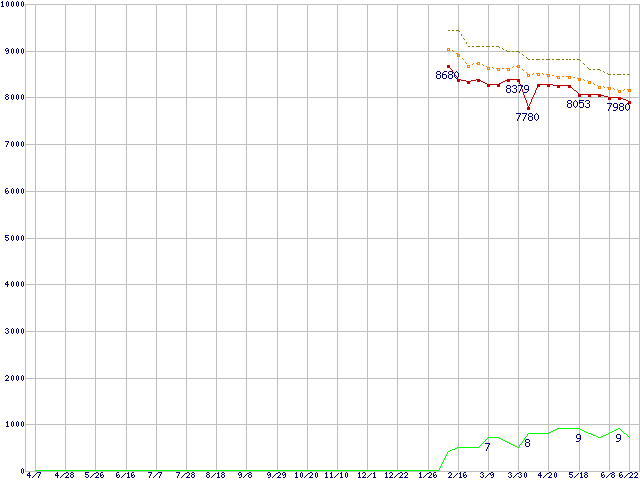 ※このグラフは過去のデータも税率5%相当に調整した税込み相当額のグラフです。 税率変更や、総額表示方式導入(2004年4月)の影響は除いています。 | | | ●凡例 | 最安値 (点線部は販売店未確認 または未調査) | 平均値 | 最高値 | ショップ数 |