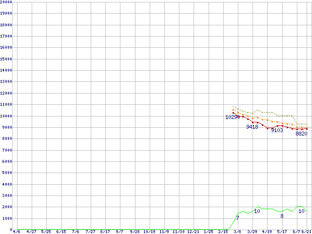※このグラフは過去のデータも税率5%相当に調整した税込み相当額のグラフです。 税率変更や、総額表示方式導入(2004年4月)の影響は除いています。 | | | ●凡例 | 最安値 (点線部は販売店未確認 または未調査) | 平均値 | 最高値 | ショップ数 |