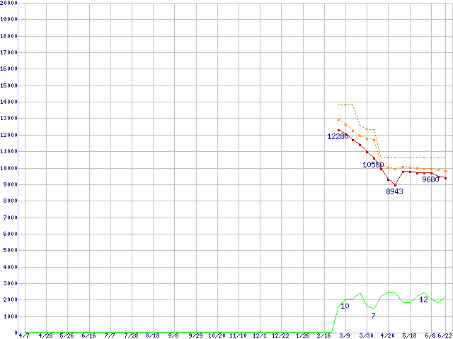 ※このグラフは過去のデータも税率5%相当に調整した税込み相当額のグラフです。 税率変更や、総額表示方式導入(2004年4月)の影響は除いています。 | | | ●凡例 | 最安値 (点線部は販売店未確認 または未調査) | 平均値 | 最高値 | ショップ数 |