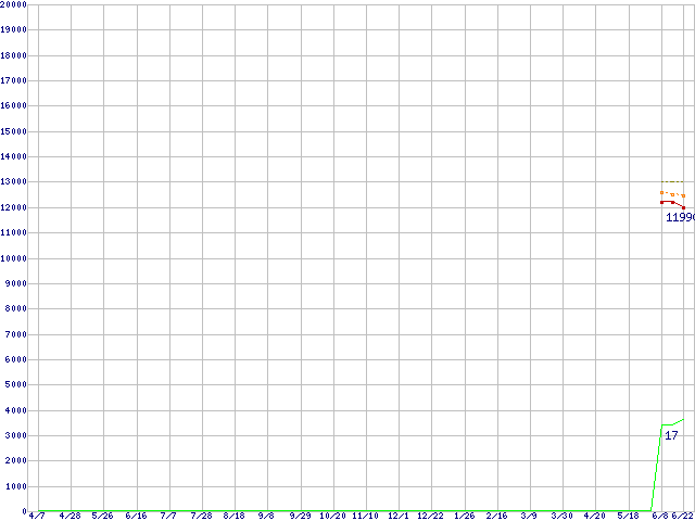※このグラフは過去のデータも税率5%相当に調整した税込み相当額のグラフです。 税率変更や、総額表示方式導入(2004年4月)の影響は除いています。 | | | ●凡例 | 最安値 (点線部は販売店未確認 または未調査) | 平均値 | 最高値 | ショップ数 |