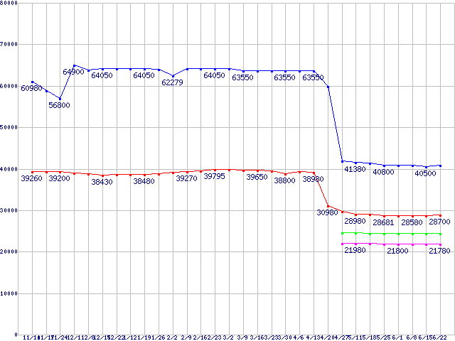 | LGA775 (FSB 1066MHz,Dual Core,EM64T対応,TDP 65W)の最安値推移 | | | (2006年11月10日~2007年6月22日) |