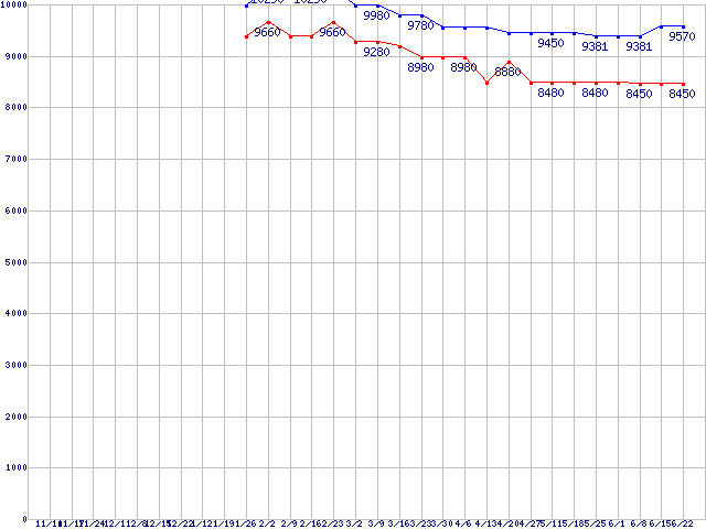 | LGA775 (FSB 800MHz,L2 2MB,Hyper-Threading,EM64T対応)の最安値推移 | | | (2006年11月10日~2007年6月22日) |
