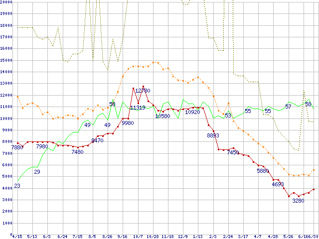 ※このグラフは過去のデータも税率5%相当に調整した税込み相当額のグラフです。 税率変更や、総額表示方式導入(2004年4月)の影響は除いています。 | | | ●凡例 | 最安値 (点線部は販売店未確認 または未調査) | 平均値 | 最高値 | ショップ数 |