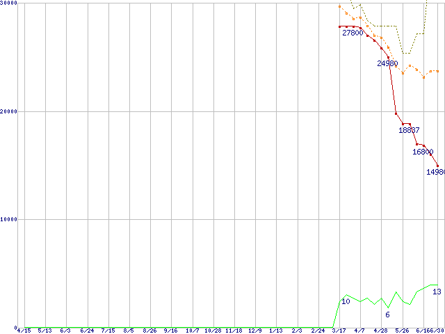 ※このグラフは過去のデータも税率5%相当に調整した税込み相当額のグラフです。 税率変更や、総額表示方式導入(2004年4月)の影響は除いています。 | | | ●凡例 | 最安値 (点線部は販売店未確認 または未調査) | 平均値 | 最高値 | ショップ数 |
