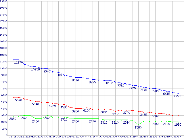 PC2-4200*(DDR2-533) DDR2 SDRAM DIMMの最安値推移