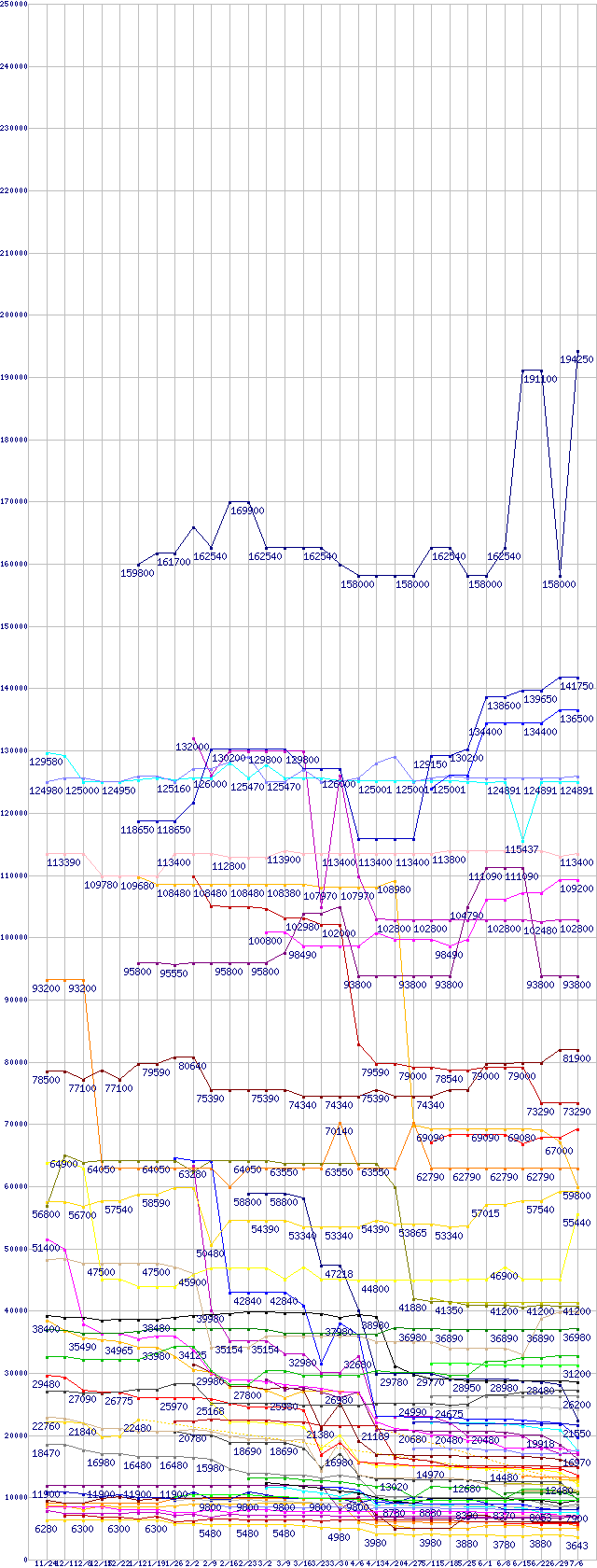 | 凡例 | Xeon X5355(2.66GHz) | Xeon E5345(2.33GHz) | Opteron 2222SE (3.0GHz) バルク | Core 2 Extreme X6800 (2.93GHz) | Core 2 Extreme QX6700 (2.66GHz) | Xeon 5160(3GHz) | Opteron 2220 (2.8GHz) | Athlon 64 FX-74 (3.0GHz) ※2個セットの価格 | Xeon E5335(2.00GHz) | Opteron 2218 (2.6GHz) | Athlon 64 FX-72 (2.8GHz) ※2個セットの価格 | Core 2 Duo T7700 (2.4GHz,L2 4MB) | Xeon E5320(1.86GHz) | Core 2 Quad Q6600 (2.40GHz,L2 4MB×2) | Opteron 2216 (2.4GHz) | Xeon E5310(1.60GHz) | Core 2 Duo T7500 (2.2GHz,L2 4MB) | Core 2 Duo E6700 (2.66GHz,L2 4MB) | Opteron 2214 (2.2GHz) | Core 2 Duo T7200 (2.00GHz,L2 4MB) | Opteron 2212 (2.0GHz) | Core 2 Duo T7300 (2.0GHz,L2 4MB) | Core 2 Duo E6600 (2.40GHz,L2 4MB) | Opteron 2210 (1.8GHz) | Core 2 Duo T7100 (1.8GHz,L2 2MB) | Core 2 Duo E6420 (2.13GHz,L2 4MB) | Athlon 64 X2 6000+ (3.0GHz,L2 1MB×2) | Core 2 Duo E6320 (1.86GHz,L2 4MB) | Athlon 64 X2 5600+ (2.8GHz,L2 1MB×2) | Core 2 Duo E4400 (2GHz,L2 2MB) | Athlon 64 X2 5200+ (2.6GHz,L2 1MB×2,TDP65W) | Celeron 540(1.86GHz,L2 1MB) | Athlon 64 X2 5200+ (2.6GHz,L2 1MB×2) | Athlon 64 X2 5400+ (2.8GHz,L2 512KB×2) | Athlon 64 X2 5000+ (2.6GHz,L2 512KB×2,TDP65W) | Athlon 64 X2 4800+ (2.5GHz,L2 512KB×2,TDP65W) | Core 2 Duo E4300 (1.80GHz,L2 2MB) | Athlon 64 X2 4600+ (2.4GHz,L2 512KB×2,TDP65W) | Athlon X2 BE-2350 (2.1GHz,L2 512KB×2,TDP 45W) | Athlon 64 X2 5000+ (2.6GHz,L2 512KB×2) | Athlon 64 X2 4200+ (2.2GHz,L2 512KB×2,Socket 939) | Athlon 64 X2 4400+ (2.3GHz,L2 512KB×2,TDP65W) | Pentium Dual-Core E2160 (1.8GHz) | Athlon X2 BE-2300 (1.9GHz,L2 512KB×2,TDP 45W) | Athlon 64 X2 4200+ (2.2GHz,L2 512KB×2,TDP65W) | Pentium Dual-Core E2140 (1.6GHz) | Athlon 64 4000+ (2.6GHz,L2 512KB) | Pentium 4 641 (3.20GHz) | Athlon 64 3800+ (2.4GHz,L2 512KB,TDP 45W) | Athlon 64 X2 4000+ (2.1GHz,L2 512KB×2,TDP65W) | Athlon 64 X2 3800+ (2.0GHz,L2 512KB×2,TDP65W) | Pentium 4 631 (3GHz) | Celeron 440 (2.0GHz) | Athlon 64 3500+ (2.2GHz,L2 512KB,Socket 939) | Athlon 64 X2 3600+ (1.9GHz,L2 512KB×2,TDP65W) | Celeron D 360 (3.46GHz) | Athlon 64 3500+ (2.2GHz,L2 512KB,TDP 45W) | Celeron 430 (1.8GHz) | Celeron D 356 (3.33GHz) | Celeron D 352 (3.20GHz) | Sempron 3600+ (2.0GHz,L2 256KB) | Athlon 64 3200+ (2.0GHz,L2 512KB) | Celeron D 347 (3.06GHz) | Celeron 420 (1.6GHz) | Sempron 3500+ (2.0GHz,L2 128KB) | Sempron 3400+ (1.8GHz,L2 256KB) | Sempron 3000+ (1.6GHz,L2 256KB) | ※製品名をクリックすると個別のグラフを表示します ※点線部は販売店が確認できなかった、または調査データがないことを示します |