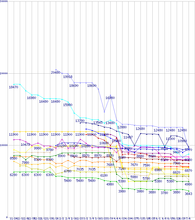 | CPU主要製品(最安値1万円未満)の最安値推移 | | | (2006年11月24日~2007年7月6日) |
