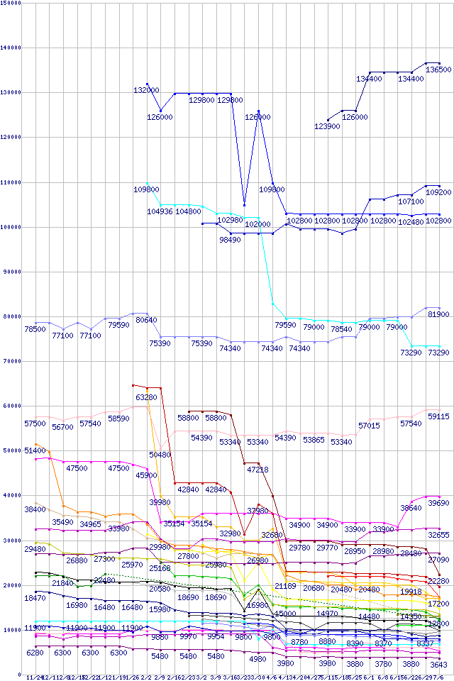 | 凡例 | Opteron 2222SE (3.0GHz) バルク | Opteron 2220 (2.8GHz) | Athlon 64 FX-74 (3.0GHz) ※2個セットの価格 | Opteron 2218 (2.6GHz) | Athlon 64 FX-72 (2.8GHz) ※2個セットの価格 | Opteron 2216 (2.4GHz) | Opteron 2214 (2.2GHz) | Opteron 2212 (2.0GHz) | Opteron 2210 (1.8GHz) | Athlon 64 X2 6000+ (3.0GHz,L2 1MB×2) | Athlon 64 X2 5600+ (2.8GHz,L2 1MB×2) | Athlon 64 X2 5200+ (2.6GHz,L2 1MB×2,TDP65W) | Athlon 64 X2 5200+ (2.6GHz,L2 1MB×2) | Athlon 64 X2 5400+ (2.8GHz,L2 512KB×2) | Athlon 64 X2 5000+ (2.6GHz,L2 512KB×2,TDP65W) | Athlon 64 X2 4800+ (2.5GHz,L2 512KB×2,TDP65W) | Athlon 64 X2 4600+ (2.4GHz,L2 512KB×2,TDP65W) | Athlon X2 BE-2350 (2.1GHz,L2 512KB×2,TDP 45W) | Athlon 64 X2 5000+ (2.6GHz,L2 512KB×2) | Athlon 64 X2 4200+ (2.2GHz,L2 512KB×2,Socket 939) | Athlon 64 X2 4400+ (2.3GHz,L2 512KB×2,TDP65W) | Athlon X2 BE-2300 (1.9GHz,L2 512KB×2,TDP 45W) | Athlon 64 X2 4200+ (2.2GHz,L2 512KB×2,TDP65W) | Athlon 64 4000+ (2.6GHz,L2 512KB) | Athlon 64 3800+ (2.4GHz,L2 512KB,TDP 45W) | Athlon 64 X2 4000+ (2.1GHz,L2 512KB×2,TDP65W) | Athlon 64 X2 3800+ (2.0GHz,L2 512KB×2,TDP65W) | Athlon 64 3500+ (2.2GHz,L2 512KB,Socket 939) | Athlon 64 X2 3600+ (1.9GHz,L2 512KB×2,TDP65W) | Athlon 64 3500+ (2.2GHz,L2 512KB,TDP 45W) | Sempron 3600+ (2.0GHz,L2 256KB) | Athlon 64 3200+ (2.0GHz,L2 512KB) | Sempron 3500+ (2.0GHz,L2 128KB) | Sempron 3400+ (1.8GHz,L2 256KB) | Sempron 3000+ (1.6GHz,L2 256KB) | ※製品名をクリックすると個別のグラフを表示します ※点線部は販売店が確認できなかった、または調査データがないことを示します |
