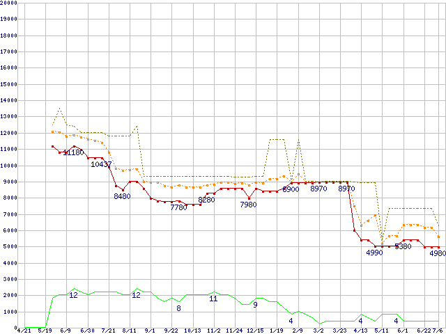 ※このグラフは過去のデータも税率5%相当に調整した税込み相当額のグラフです。 税率変更や、総額表示方式導入(2004年4月)の影響は除いています。 | | | ●凡例 | 最安値 (点線部は販売店未確認 または未調査) | 平均値 | 最高値 | ショップ数 |