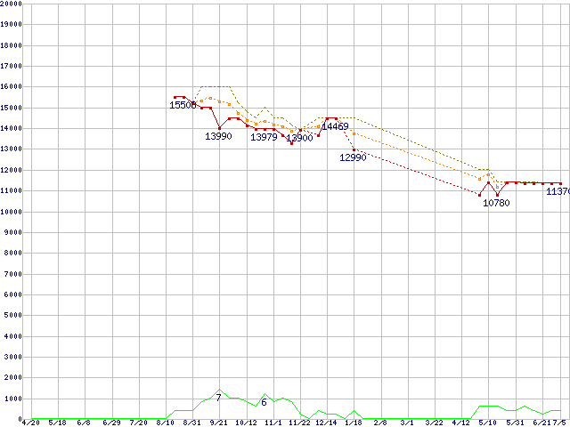 ※このグラフは過去のデータも税率5%相当に調整した税込み相当額のグラフです。 税率変更や、総額表示方式導入(2004年4月)の影響は除いています。 | | | ●凡例 | 最安値 (点線部は販売店未確認 または未調査) | 平均値 | 最高値 | ショップ数 |