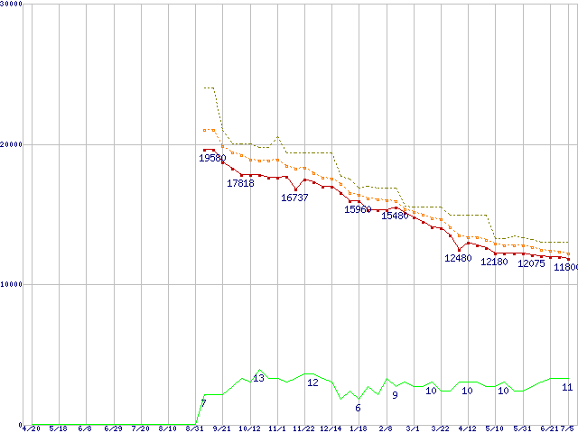 ※このグラフは過去のデータも税率5%相当に調整した税込み相当額のグラフです。 税率変更や、総額表示方式導入(2004年4月)の影響は除いています。 | | | ●凡例 | 最安値 (点線部は販売店未確認 または未調査) | 平均値 | 最高値 | ショップ数 |