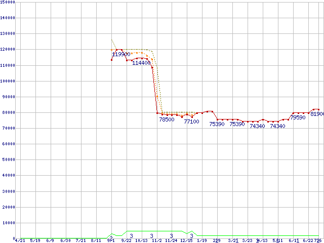 ※このグラフは過去のデータも税率5%相当に調整した税込み相当額のグラフです。 税率変更や、総額表示方式導入(2004年4月)の影響は除いています。 | | | ●凡例 | 最安値 (点線部は販売店未確認 または未調査) | 平均値 | 最高値 | ショップ数 |