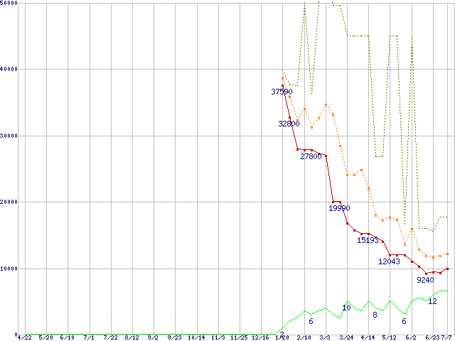 ※このグラフは過去のデータも税率5%相当に調整した税込み相当額のグラフです。 税率変更や、総額表示方式導入(2004年4月)の影響は除いています。 | | | ●凡例 | 最安値 (点線部は販売店未確認 または未調査) | 平均値 | 最高値 | ショップ数 |