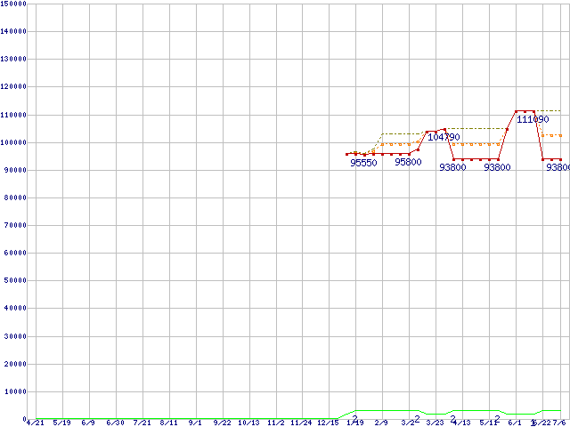 ※このグラフは過去のデータも税率5%相当に調整した税込み相当額のグラフです。 税率変更や、総額表示方式導入(2004年4月)の影響は除いています。 | | | ●凡例 | 最安値 (点線部は販売店未確認 または未調査) | 平均値 | 最高値 | ショップ数 |