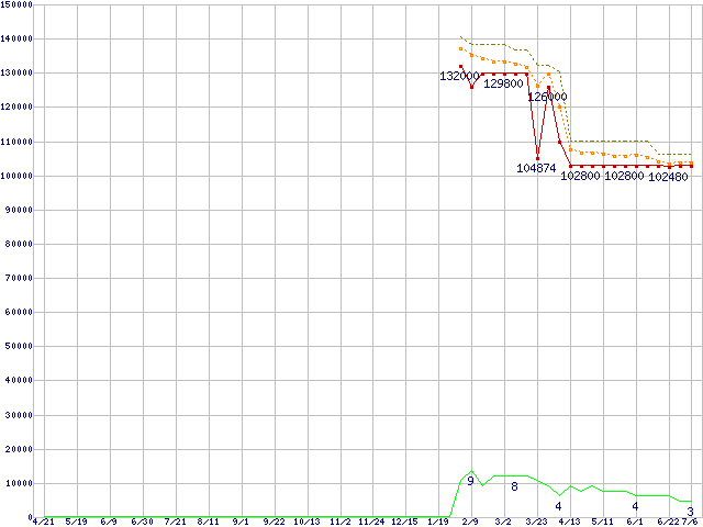 ※このグラフは過去のデータも税率5%相当に調整した税込み相当額のグラフです。 税率変更や、総額表示方式導入(2004年4月)の影響は除いています。 | | | ●凡例 | 最安値 (点線部は販売店未確認 または未調査) | 平均値 | 最高値 | ショップ数 |