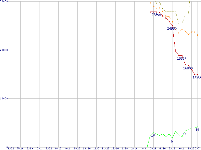 ※このグラフは過去のデータも税率5%相当に調整した税込み相当額のグラフです。 税率変更や、総額表示方式導入(2004年4月)の影響は除いています。 | | | ●凡例 | 最安値 (点線部は販売店未確認 または未調査) | 平均値 | 最高値 | ショップ数 |