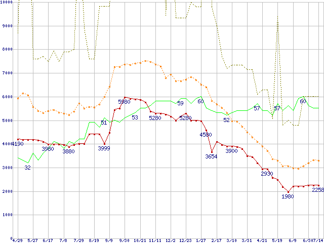※このグラフは過去のデータも税率5%相当に調整した税込み相当額のグラフです。 税率変更や、総額表示方式導入(2004年4月)の影響は除いています。 | | | ●凡例 | 最安値 (点線部は販売店未確認 または未調査) | 平均値 | 最高値 | ショップ数 |