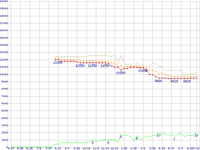 ※このグラフは過去のデータも税率5%相当に調整した税込み相当額のグラフです。 税率変更や、総額表示方式導入(2004年4月)の影響は除いています。 | | | ●凡例 | 最安値 (点線部は販売店未確認 または未調査) | 平均値 | 最高値 | ショップ数 |