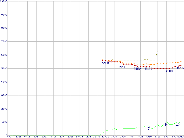 ※このグラフは過去のデータも税率5%相当に調整した税込み相当額のグラフです。 税率変更や、総額表示方式導入(2004年4月)の影響は除いています。 | | | ●凡例 | 最安値 (点線部は販売店未確認 または未調査) | 平均値 | 最高値 | ショップ数 |