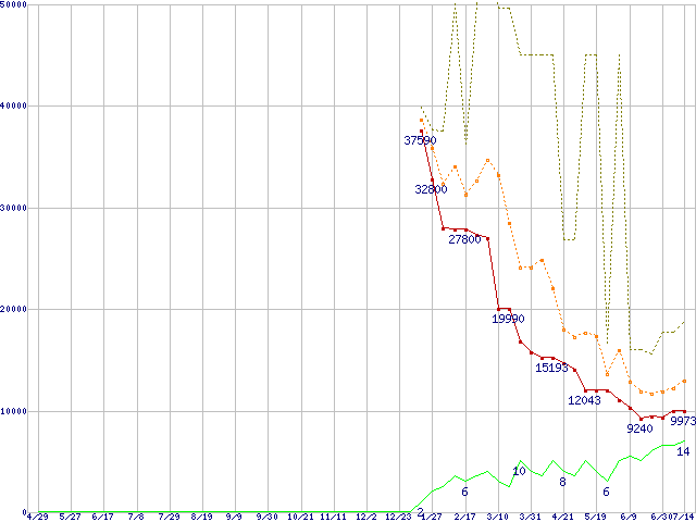 ※このグラフは過去のデータも税率5%相当に調整した税込み相当額のグラフです。 税率変更や、総額表示方式導入(2004年4月)の影響は除いています。 | | | ●凡例 | 最安値 (点線部は販売店未確認 または未調査) | 平均値 | 最高値 | ショップ数 |