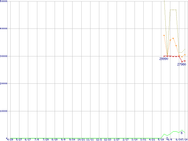 ※このグラフは過去のデータも税率5%相当に調整した税込み相当額のグラフです。 税率変更や、総額表示方式導入(2004年4月)の影響は除いています。 | | | ●凡例 | 最安値 (点線部は販売店未確認 または未調査) | 平均値 | 最高値 | ショップ数 |