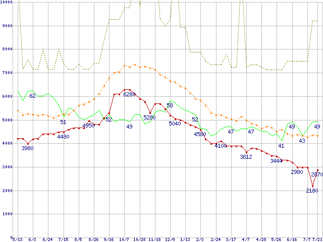 ※このグラフは過去のデータも税率5%相当に調整した税込み相当額のグラフです。 税率変更や、総額表示方式導入(2004年4月)の影響は除いています。 | | | ●凡例 | 最安値 (点線部は販売店未確認 または未調査) | 平均値 | 最高値 | ショップ数 |
