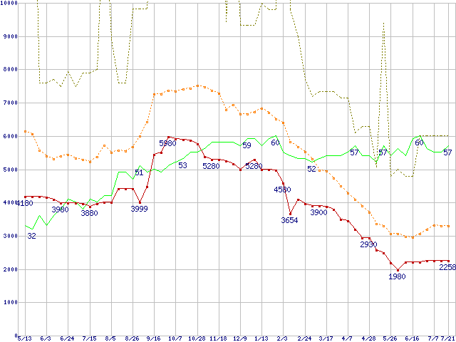 ※このグラフは過去のデータも税率5%相当に調整した税込み相当額のグラフです。 税率変更や、総額表示方式導入(2004年4月)の影響は除いています。 | | | ●凡例 | 最安値 (点線部は販売店未確認 または未調査) | 平均値 | 最高値 | ショップ数 |