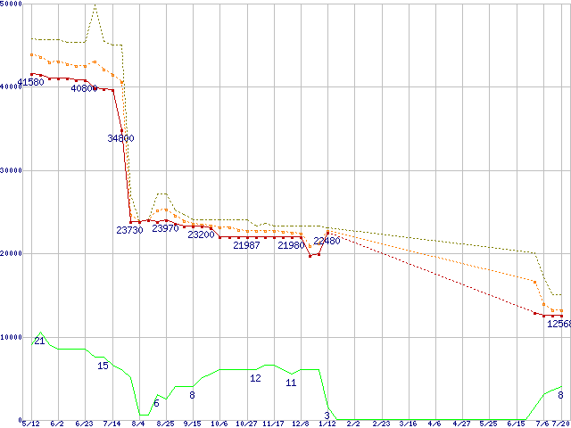 ※このグラフは過去のデータも税率5%相当に調整した税込み相当額のグラフです。 税率変更や、総額表示方式導入(2004年4月)の影響は除いています。 | | | ●凡例 | 最安値 (点線部は販売店未確認 または未調査) | 平均値 | 最高値 | ショップ数 |