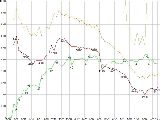 ※このグラフは過去のデータも税率5%相当に調整した税込み相当額のグラフです。 税率変更や、総額表示方式導入(2004年4月)の影響は除いています。 | | | ●凡例 | 最安値 (点線部は販売店未確認 または未調査) | 平均値 | 最高値 | ショップ数 |