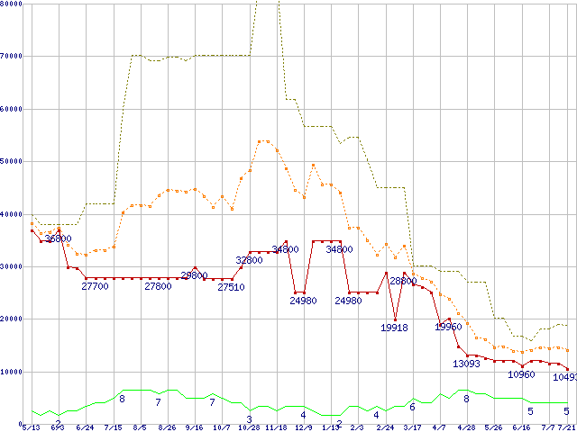 ※このグラフは過去のデータも税率5%相当に調整した税込み相当額のグラフです。 税率変更や、総額表示方式導入(2004年4月)の影響は除いています。 | | | ●凡例 | 最安値 (点線部は販売店未確認 または未調査) | 平均値 | 最高値 | ショップ数 |