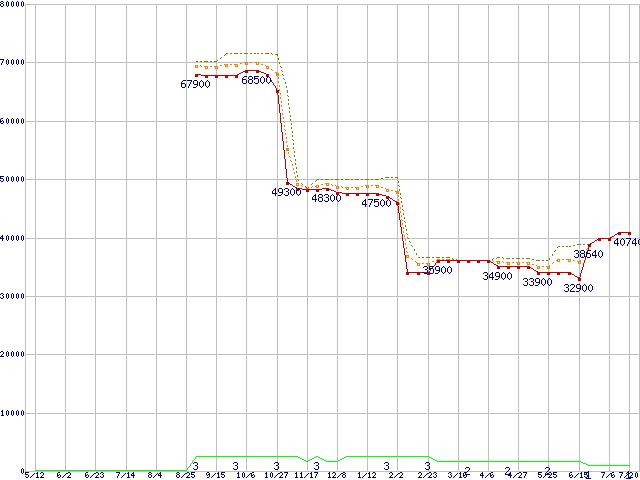 ※このグラフは過去のデータも税率5%相当に調整した税込み相当額のグラフです。 税率変更や、総額表示方式導入(2004年4月)の影響は除いています。 | | | ●凡例 | 最安値 (点線部は販売店未確認 または未調査) | 平均値 | 最高値 | ショップ数 |