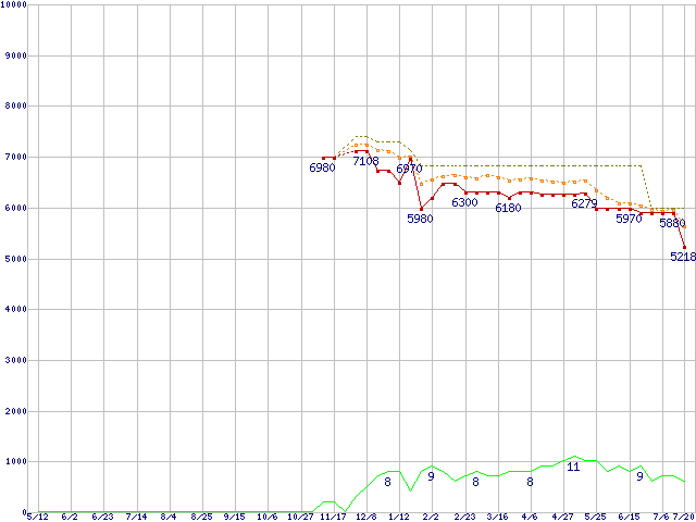 ※このグラフは過去のデータも税率5%相当に調整した税込み相当額のグラフです。 税率変更や、総額表示方式導入(2004年4月)の影響は除いています。 | | | ●凡例 | 最安値 (点線部は販売店未確認 または未調査) | 平均値 | 最高値 | ショップ数 |