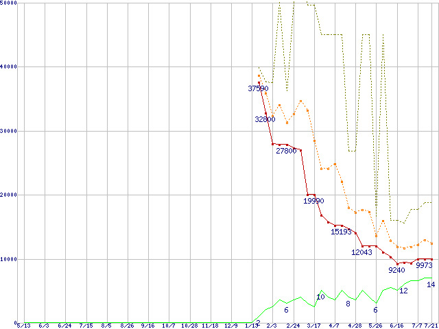※このグラフは過去のデータも税率5%相当に調整した税込み相当額のグラフです。 税率変更や、総額表示方式導入(2004年4月)の影響は除いています。 | | | ●凡例 | 最安値 (点線部は販売店未確認 または未調査) | 平均値 | 最高値 | ショップ数 |