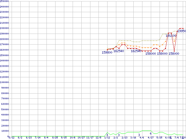 ※このグラフは過去のデータも税率5%相当に調整した税込み相当額のグラフです。 税率変更や、総額表示方式導入(2004年4月)の影響は除いています。 | | | ●凡例 | 最安値 (点線部は販売店未確認 または未調査) | 平均値 | 最高値 | ショップ数 |