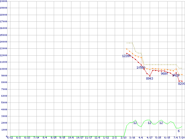 ※このグラフは過去のデータも税率5%相当に調整した税込み相当額のグラフです。 税率変更や、総額表示方式導入(2004年4月)の影響は除いています。 | | | ●凡例 | 最安値 (点線部は販売店未確認 または未調査) | 平均値 | 最高値 | ショップ数 |