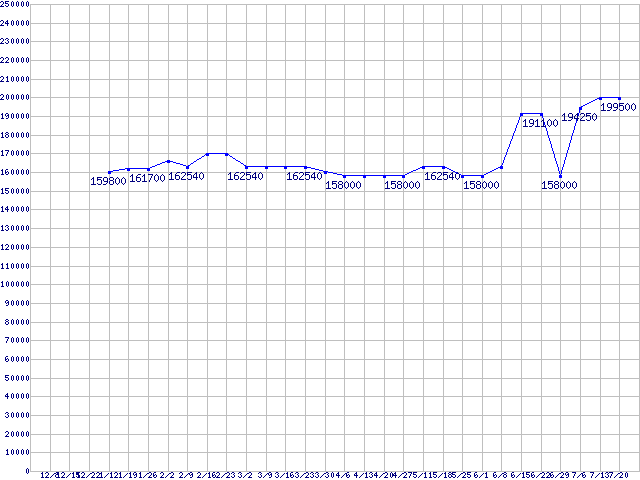 | LGA771(FSB 1333MHz,Quad Core,L2 4MB×2,TDP 120W)の最安値推移 | | | (2006年12月8日~2007年7月20日) |