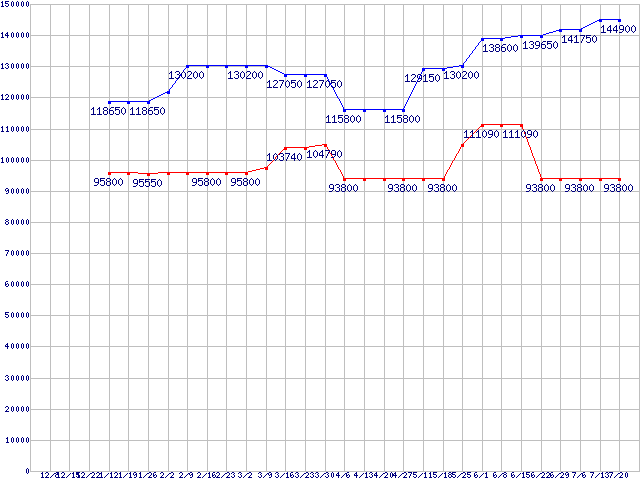 | LGA771(FSB 1333MHz,Quad Core,L2 4MB×2,TDP 80W)の最安値推移 | | | (2006年12月8日~2007年7月20日) |