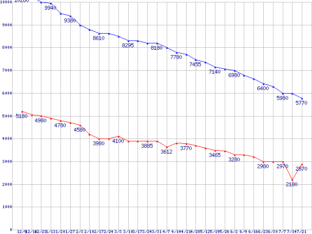 PC2-6400(DDR2-800) DDR2 SDRAM DIMMの最安値推移