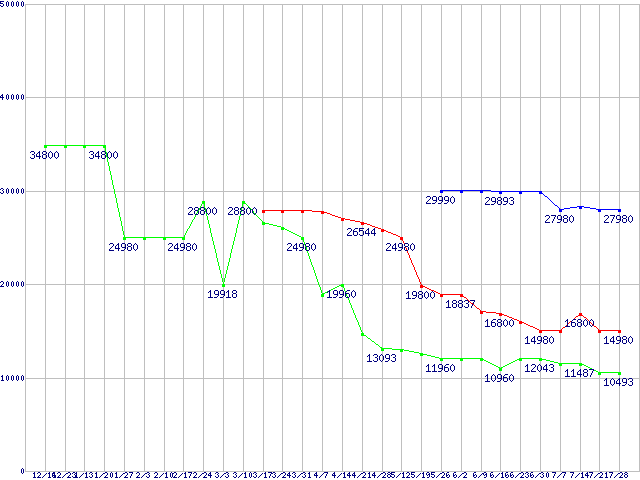 メモリ主要製品(最安値1万円以上)の最安値推移