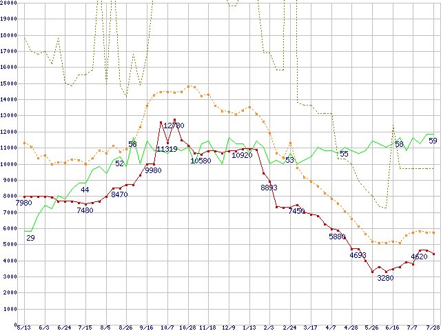 ※このグラフは過去のデータも税率5%相当に調整した税込み相当額のグラフです。 税率変更や、総額表示方式導入(2004年4月)の影響は除いています。 | | | ●凡例 | 最安値 (点線部は販売店未確認 または未調査) | 平均値 | 最高値 | ショップ数 |
