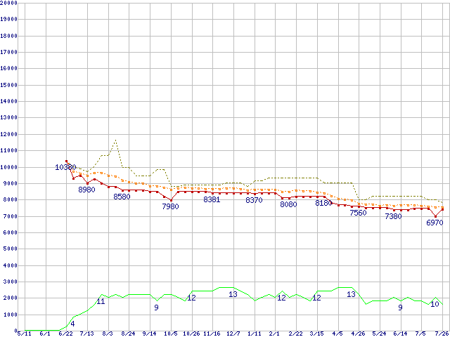 ※このグラフは過去のデータも税率5%相当に調整した税込み相当額のグラフです。 税率変更や、総額表示方式導入(2004年4月)の影響は除いています。 | | | ●凡例 | 最安値 (点線部は販売店未確認 または未調査) | 平均値 | 最高値 | ショップ数 |
