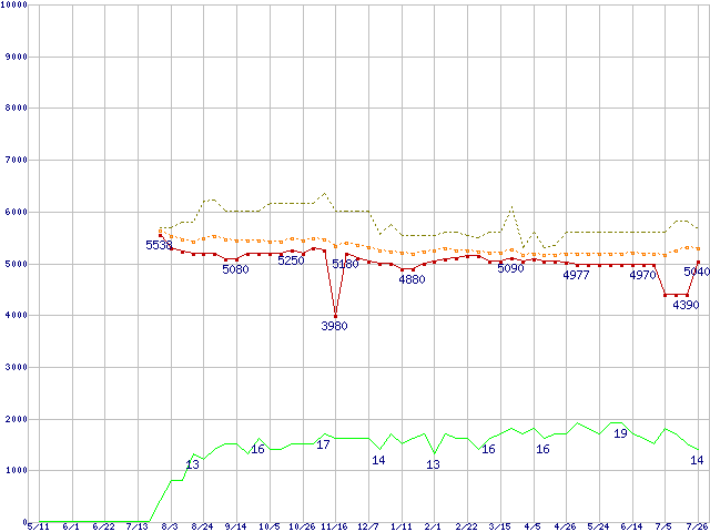 ※このグラフは過去のデータも税率5%相当に調整した税込み相当額のグラフです。 税率変更や、総額表示方式導入(2004年4月)の影響は除いています。 | | | ●凡例 | 最安値 (点線部は販売店未確認 または未調査) | 平均値 | 最高値 | ショップ数 |