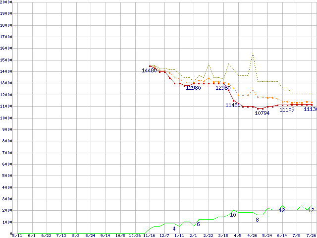 ※このグラフは過去のデータも税率5%相当に調整した税込み相当額のグラフです。 税率変更や、総額表示方式導入(2004年4月)の影響は除いています。 | | | ●凡例 | 最安値 (点線部は販売店未確認 または未調査) | 平均値 | 最高値 | ショップ数 |