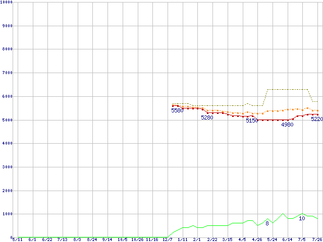 ※このグラフは過去のデータも税率5%相当に調整した税込み相当額のグラフです。 税率変更や、総額表示方式導入(2004年4月)の影響は除いています。 | | | ●凡例 | 最安値 (点線部は販売店未確認 または未調査) | 平均値 | 最高値 | ショップ数 |