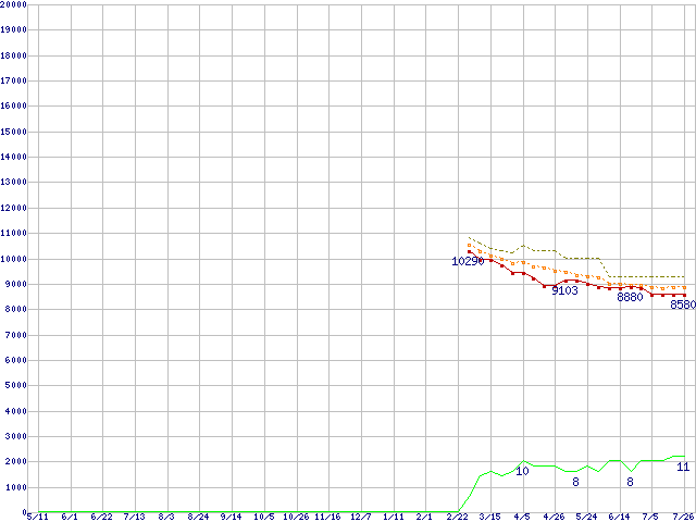 ※このグラフは過去のデータも税率5%相当に調整した税込み相当額のグラフです。 税率変更や、総額表示方式導入(2004年4月)の影響は除いています。 | | | ●凡例 | 最安値 (点線部は販売店未確認 または未調査) | 平均値 | 最高値 | ショップ数 |