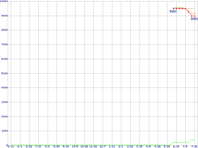 ※このグラフは過去のデータも税率5%相当に調整した税込み相当額のグラフです。 税率変更や、総額表示方式導入(2004年4月)の影響は除いています。 | | | ●凡例 | 最安値 (点線部は販売店未確認 または未調査) | 平均値 | 最高値 | ショップ数 |