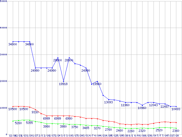 PC2-4200*(DDR2-533) DDR2 SDRAM DIMMの最安値推移