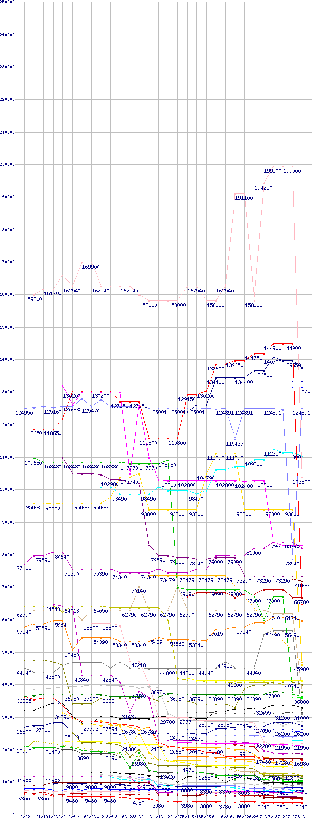 | 凡例 | Opteron 2222SE (3.0GHz) バルク | Core 2 Extreme QX6850 (3GHz) | Core 2 Extreme QX6800 (2.93GHz) | Core 2 Extreme QX6700 (2.66GHz) | Opteron 2220 (2.8GHz) | Xeon X5355(2.66GHz) | Athlon 64 FX-74 (3.0GHz) ※2個セットの価格 | Opteron 2218 (2.6GHz) | Athlon 64 FX-72 (2.8GHz) ※2個セットの価格 | Core 2 Quad Q6700 (2.66GHz,L2 4MB×2) | Core 2 Duo T7700 (2.4GHz,L2 4MB) | Xeon E5345(2.33GHz) | Opteron 2216 (2.4GHz) | Xeon L5320(1.86GHz) | Xeon E5335(2.00GHz) | Core 2 Duo T7500 (2.2GHz,L2 4MB) | Core 2 Duo E6700 (2.66GHz,L2 4MB) | Opteron 2214 (2.2GHz) | Xeon E5320(1.86GHz) | Core 2 Duo T7200 (2.00GHz,L2 4MB) | Core 2 Quad Q6600 (2.40GHz,L2 4MB×2) | Core 2 Duo E6850 (3GHz,L2 4MB) | Opteron 2212 (2.0GHz) | Core 2 Duo T7300 (2.0GHz,L2 4MB) | Xeon E5310(1.60GHz) | Core 2 Duo E6600 (2.40GHz,L2 4MB) | Opteron 2210 (1.8GHz) | Core 2 Duo T7100 (1.8GHz,L2 2MB) | Core 2 Duo E6750 (2.66GHz,L2 4MB) | Core 2 Duo E6420 (2.13GHz,L2 4MB) | Core 2 Duo E6550 (2.33GHz,L2 4MB) | Athlon 64 X2 6000+ (3.0GHz,L2 1MB×2) | Core 2 Duo E6320 (1.86GHz,L2 4MB) | Athlon 64 X2 5600+ (2.8GHz,L2 1MB×2) | Core 2 Duo E4500 (2.20GHz,L2 2MB) | Celeron 540(1.86GHz,L2 1MB) | Athlon 64 X2 5200+ (2.6GHz,L2 1MB×2,TDP65W) | Athlon 64 X2 5200+ (2.6GHz,L2 1MB×2) | Core 2 Duo E4400 (2GHz,L2 2MB) | Athlon 64 X2 5000+ (2.6GHz,L2 512KB×2,TDP65W) | Athlon 64 X2 4800+ (2.5GHz,L2 512KB×2,TDP65W) | Core 2 Duo E4300 (1.80GHz,L2 2MB) | Athlon 64 X2 4200+ (2.2GHz,L2 512KB×2,Socket 939) | Athlon 64 X2 4400+ (2.3GHz,L2 512KB×2,TDP65W) | Athlon X2 BE-2350 (2.1GHz,L2 512KB×2,TDP 45W) | Pentium Dual-Core E2160 (1.8GHz) | Athlon 64 X2 4200+ (2.2GHz,L2 512KB×2,TDP65W) | Athlon X2 BE-2300 (1.9GHz,L2 512KB×2,TDP 45W) | Athlon 64 4000+ (2.6GHz,L2 512KB) | Athlon 64 X2 4000+ (2.1GHz,L2 512KB×2,TDP65W) | Pentium Dual-Core E2140 (1.6GHz) | Athlon 64 3800+ (2.4GHz,L2 512KB,TDP 45W) | Pentium 4 631 (3GHz) | Celeron 440 (2.0GHz) | Celeron D 356 (3.33GHz) | Athlon 64 X2 3600+ (1.9GHz,L2 512KB×2,TDP65W) | Athlon 64 3500+ (2.2GHz,L2 512KB,TDP 45W) | Celeron D 352 (3.20GHz) | Celeron 430 (1.8GHz) | Sempron 3600+ (2.0GHz,L2 256KB) | Celeron 420 (1.6GHz) | Sempron 3500+ (2.0GHz,L2 128KB) | Celeron D 347 (3.06GHz) | Sempron 3000+ (1.6GHz,L2 256KB) | |