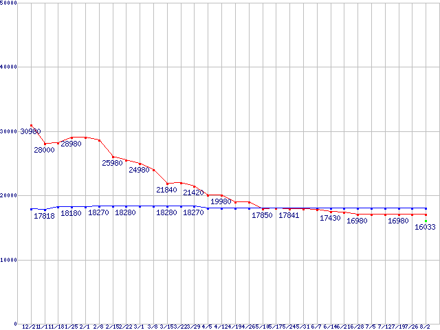 HDD主要製品(最安値1万5千円~2万円未満)の最安値推移