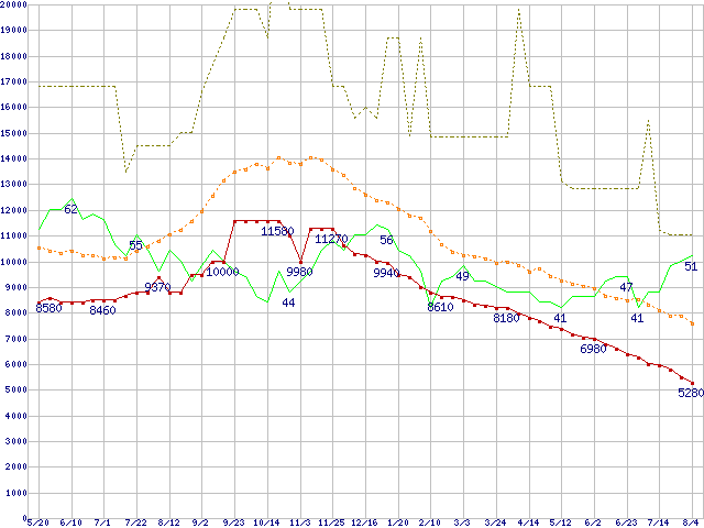 ※このグラフは過去のデータも税率5%相当に調整した税込み相当額のグラフです。 税率変更や、総額表示方式導入(2004年4月)の影響は除いています。 | | | ●凡例 | 最安値 (点線部は販売店未確認 または未調査) | 平均値 | 最高値 | ショップ数 |
